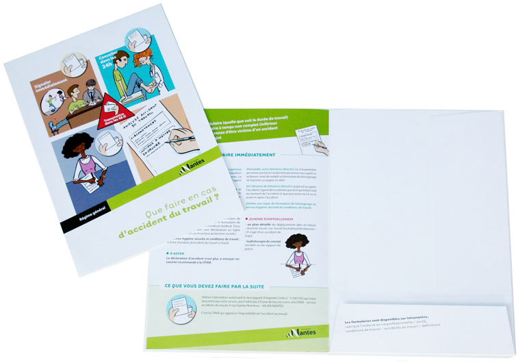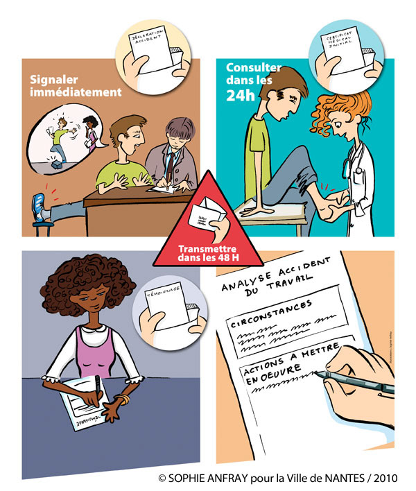illustrations pédagogiques résumant les démarches à effectuer en cas d’accident du travail pour une pochette destinée aux agents de la ville. Client : Ville de Nantes