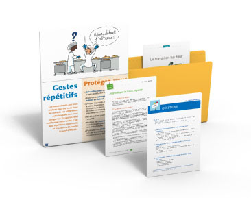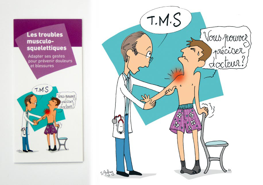 Dessins d'humour pour des affiches et dépliants à destination des entreprises sur la prévention des TMS au travail et comment adapter ses gestes pour prévenir douleurs et blessures. Clients : Editions Tissot (réalisation, édition et commercialisation des documents).