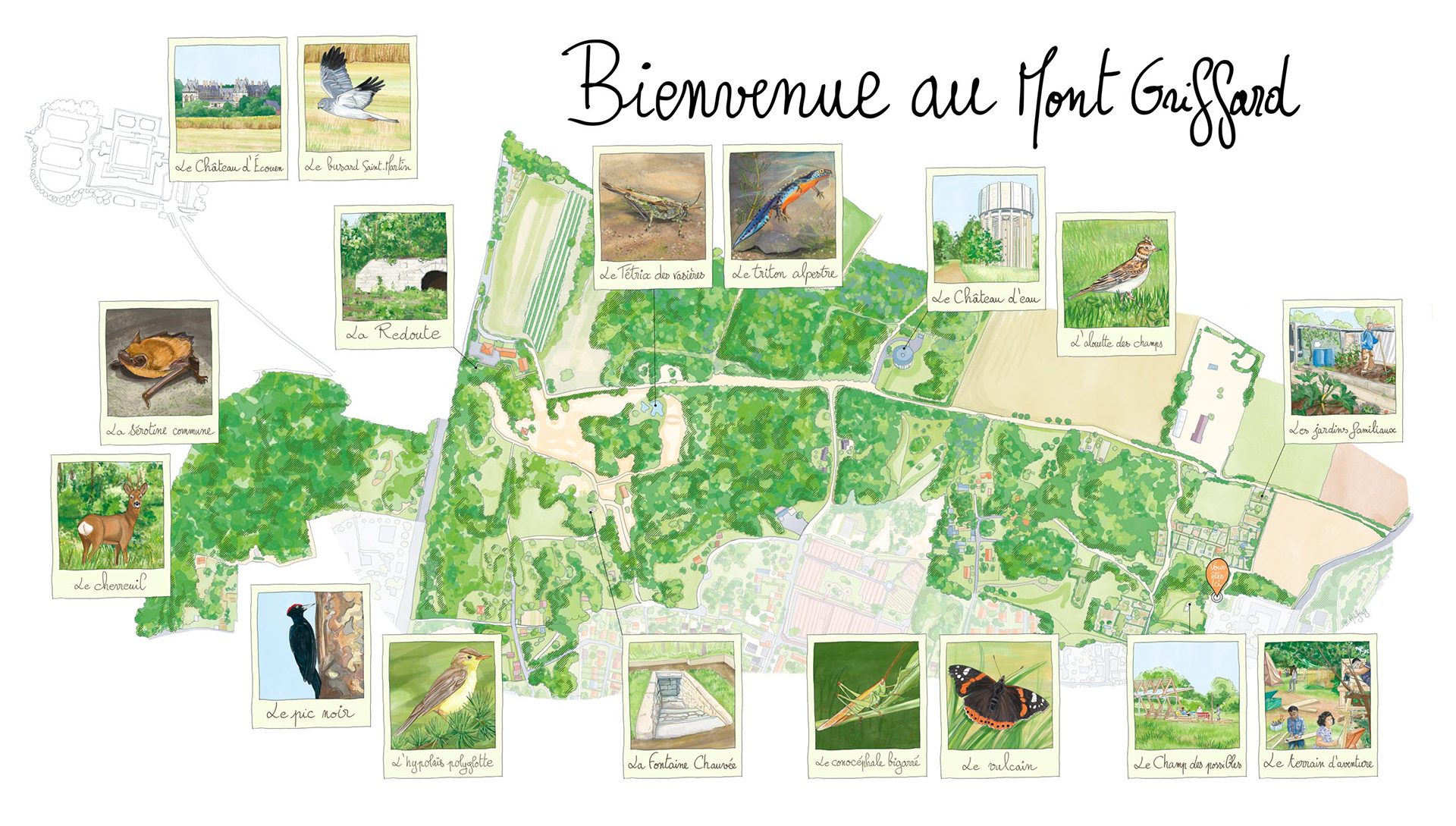 Carte illustrée pour un panneau d'information d'un départ de randonnée de la ville de Villiers le Bel. Client : Ville de Villiers le bel