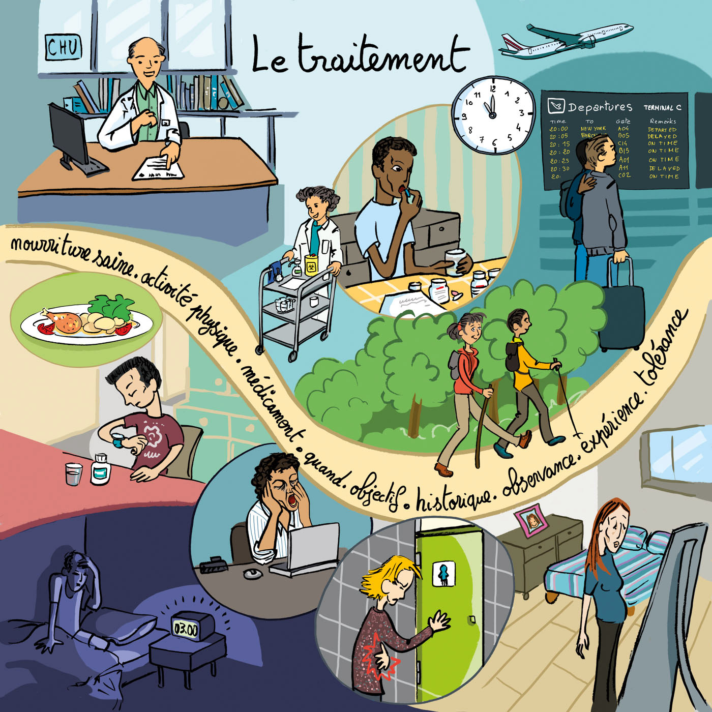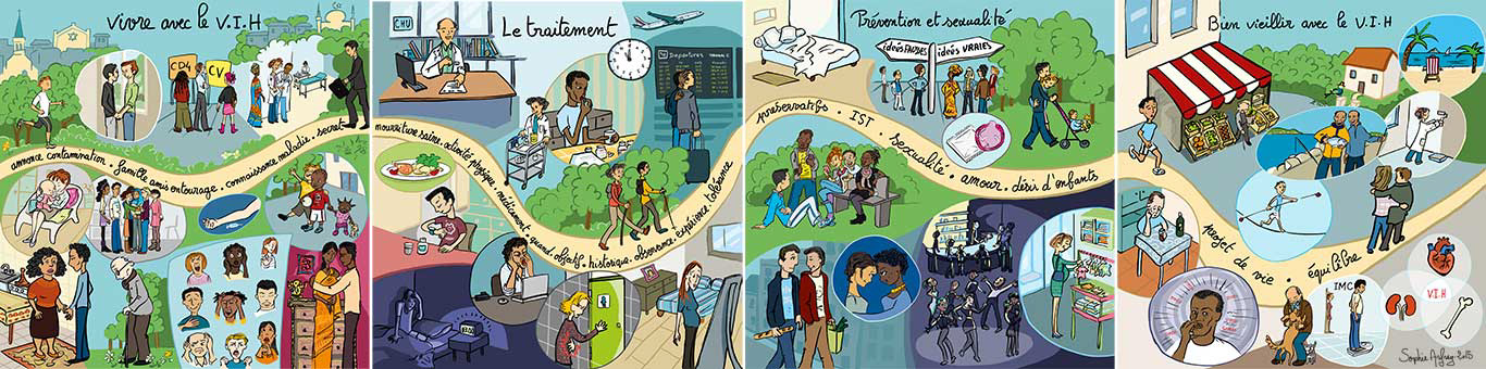 Illustrations pour un "cube" d'aide au dialogue, au questionnement dans les séances d’éducation thérapeutiques du patient en infectiologie - VIH. Le but étant de maintenir et améliorer la qualité de vie des patients. Client : Célidée pour L'hôpital Européen de Marseille.