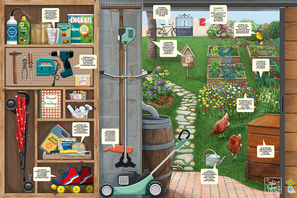 Illustrations pour un stand interactif où la consommation responsable et la valorisation des déchets sont à l'honneur. Chaque coin du garage ou du jardin recèle des astuces pour favoriser les bonnes pratiques et lutter contre le gaspillage sous toutes ses formes. Client : Trifyl