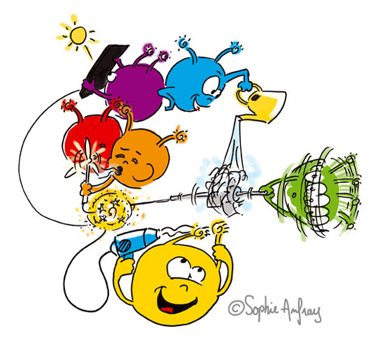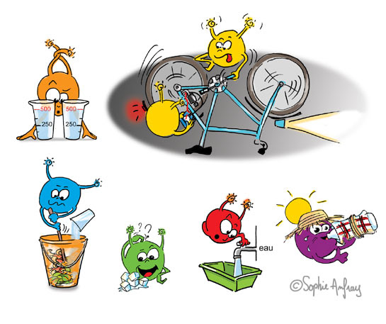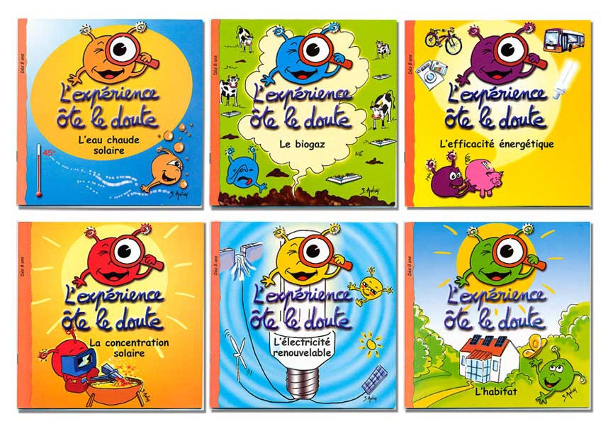 L'expérience ôte le doute Illustrations pour une série de livrets pédagogiques destinées aux enseignants, animateurs et parents pour permettre aux enfants, par l'expérience, de mieux comprendre ce que sont les énergies renouvelables . Création graphique des personnages les photoniz. Editions IDsolaires