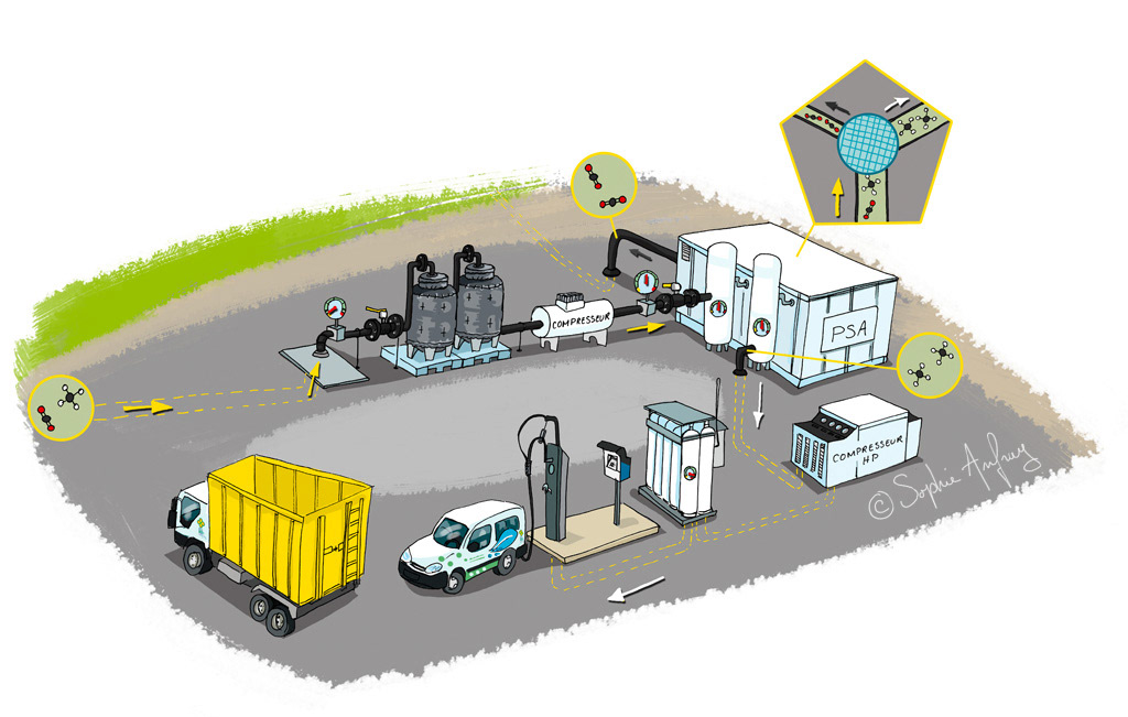 Schéma de fonctionnement de l'unité de production de biométhane-carburant, qui couplée au bioréacteur, permet d’épurer le biogaz et de produire jusqu’à 800 m³ par jour de carburant. Illustrations pour des panneaux et documents de communication print et web. Client : Trifyl