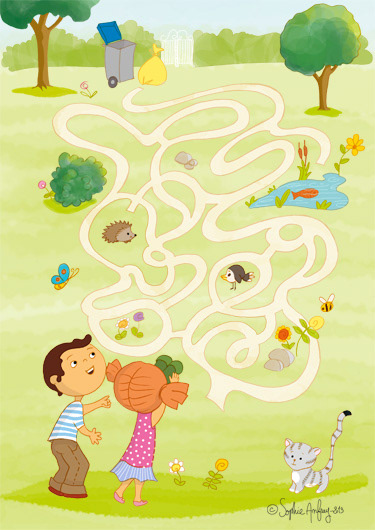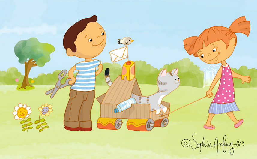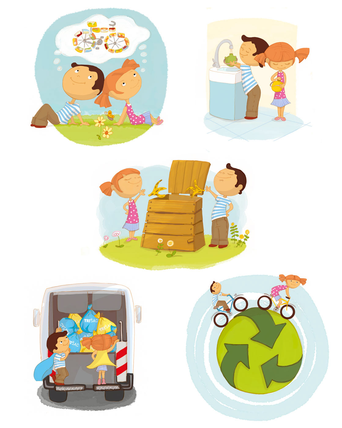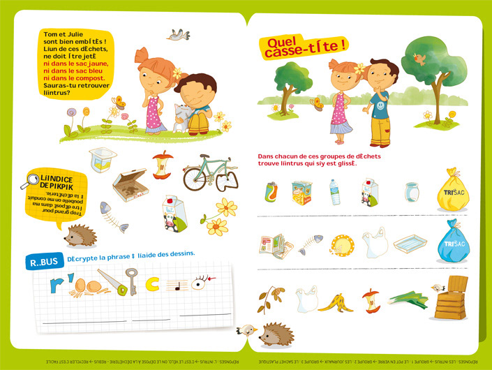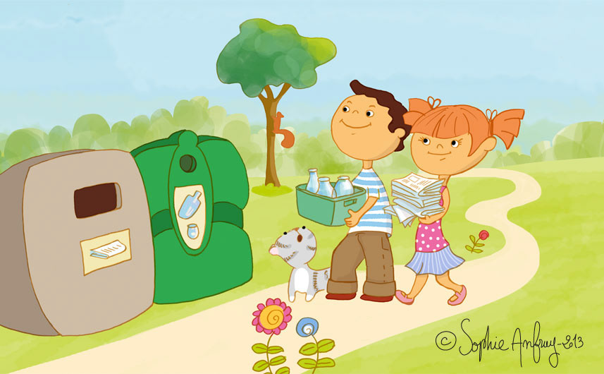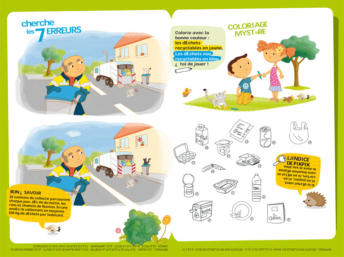 Illustrations pédagogiques et ludiques sur le thème du tri sélectif pour un livret de sensibilisation sur la réduction des déchets pour les 6 ans et plus. Client : Liner Communication pour Nantes Métropole